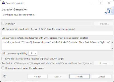 For Javadoc, the top of the documentation hierarchy is the overview file. This is just a normal HTML file, but it can contain Javadoc tags such as @see and {@linkplain}. By convention the file is named overview.html and is placed in the root of a project's source tree (note that these are conventions; you can name the file anything and put it anywhere you like). The overview page typically provides a high level view of a project, such as an application or an API consisting of multiple packages. For a good example of an overview file, see JAMA : A Java Matrix Package, from the National Institute of Standards and Technology (NIST). Here's the overview page that I wrote for our project (not nearly as good as the NIST page); it's stored in the src directory of the project root.1 2 3 4 5 6 7 8 9 10 11 12 13 14 15 16 17 18 19 20 21 22 23 24 25 26 27 28 29 30 31 32 33 34 35 36 37 38 39 40 41 42 43 44 45 46 47 48 49 50 51 52 53 54 55 56 57 | <html> <body> <h1>The Cartesian Plane Project</h1> <p> This project has been developed as a part of a tutorial focused on various Java subjects, notably grahics applications. The heart of the project is an application with a window that can be used to display graphics. The window containing the graphics is contained in the {@linkplain com.acmemail.judah.cartesian_plane.graphics_utils.Root} class, which simplifies creating and starting a small, windowed application that runs under the control of the javax.Swing package. </p> <p> Some of the Java concepts explored as part of this project are: </p> <ul> <li>Java project development</li> <li>Use of Eclipse in project development</li> <li>Encapsulation</li> <li>Drawing text and geometric obects in a graphics window</li> <li>The Iterator<E> and Iterable<E> interfaces</li> <li>Use of the Javadoc tool</li> <li>Use of JUnit for testing</li> <li>Inner classes</li> <li>Anonymous classes</li> <li>Lambdas</li> <li>Property management</li> <li>Functional programming</li> <li>Streams</li> <li>Grahical user interfaces (GUIs) </ul> <p> All the code generate as part of this project is stored in GitHub under <a href="https://github.com/Judah-s-Tutorials/JudahsTutorials"> Judah's Tutorials. </a> The book <a href="https://www.amazon.com/Effective-Java-Joshua-Bloch/dp/0134685997/ref=sr_1_1?crid=3Q02PLH5ZQ2RS&keywords=effective+java&qid=1671321666&s=books&sprefix=effective+java%2Cstripbooks%2C143&sr=1-1&ufe=app_do%3Aamzn1.fos.18ed3cb5-28d5-4975-8bc7-93deae8f9840"> Effective Java, by Joshua Bloch" </a> is a reference used frequently for this tutorial. </p> <p> @see "Bloch, Joshua. Effective Java. Addison-Wesley, 2018." @see <a href="https://github.com/Judah-s-Tutorials/JudahsTutorials"> Judah's Tutorials </a> repository on GitHub </p> </body> </html> |